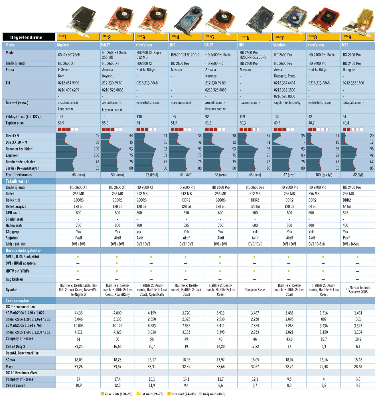 Tek slotluk yapısıyla toplam puanda birinci olan Gigabyte'ın 2600XT'si, pasif soğutma çözümünde de yeterli verimi sağlıyor. Buna karşın performansı da rakiplerinin önünde. Tek dezavantajı ise overclock için çok fazla yeri olmaması. HIS'in 2600 Pro'su ise bu alanda rakiplerinden daha önde. Uzun zamandır tanıdığımız IceQ soğutma sistemi cihazı overclock ederek yüzde 18 civarında performans artışı sağlıyor. Bu fiyat segmentinde çoğu üretici kutu içeriğini kısmaya yönelirken, firma DVI - HDMI adaptörünü de kutuya dâhil etmiyor. Palit'in 2600XT/Pro ve GeCube'ün 2400 modellerinde ise arka panele dâhil edilen HDMI çıkışı, adaptör ihtiyacını ortadan kaldırıyor. Kutu içeriği demişken AMD'nin Valve ile yaptığı anlaşma sayesinde yeni çıkan AMD kartların tamamına yakını üç güzel oyun, HalfLife2 Lost Coast ve DeathMatch ile geliyor.