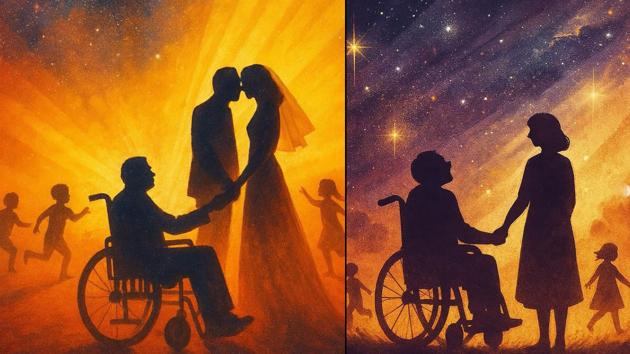 Resimde, tekerlekli sandalyede oturan bir erkek ile ayakta duran bir kadın, el ele tutuşarak birbirlerine bakıyorlar. Arka planda parlayan yıldızlar, bulutsular ve ışık huzmeleriyle dolu, turuncu, mor ve lacivert tonlarında büyüleyici bir gece gökyüzü yer alıyor. Ön planda ise iki çocuğun koşan siluetleri görülüyor. Görsel, sevgi, birliktelik, umut ve engellerin ötesinde bir aşk temasını işliyor gibi görünüyor."