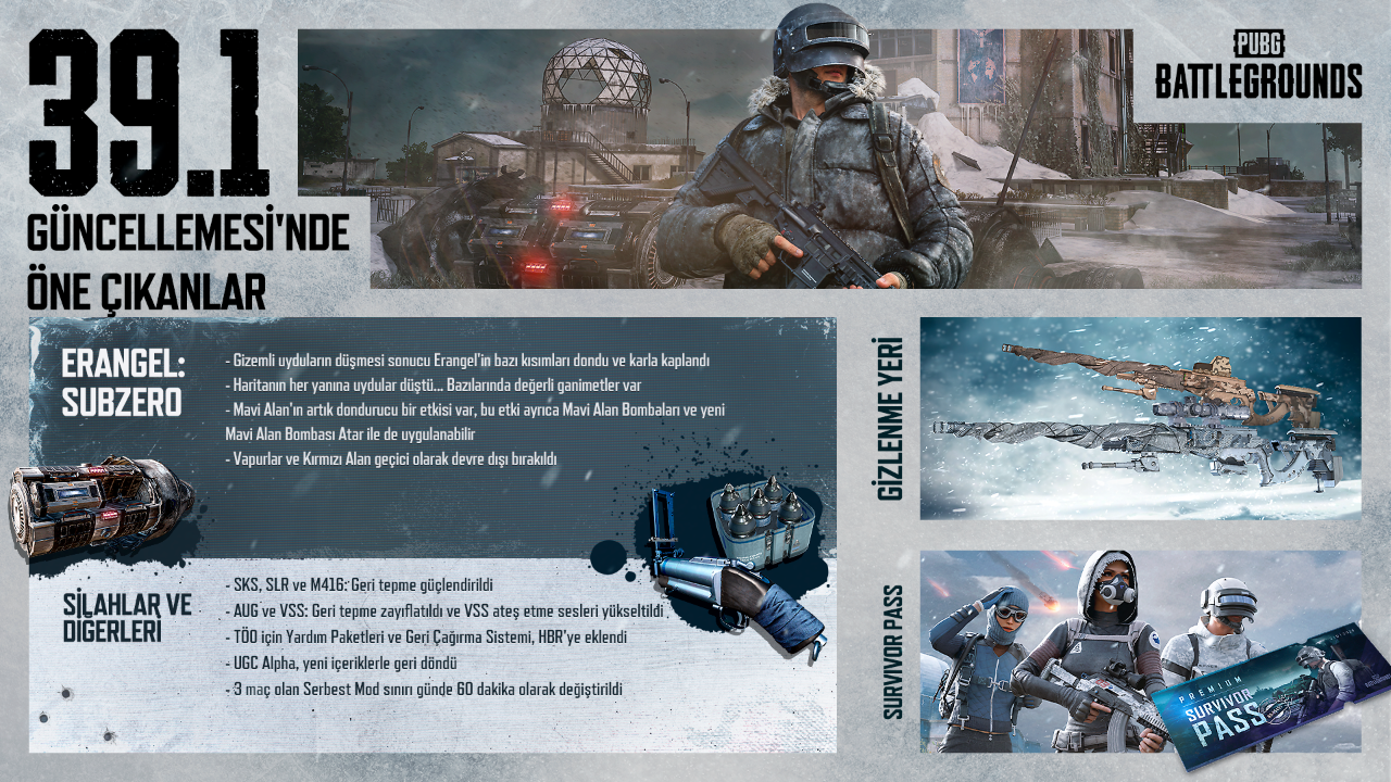 PUBG: BATTLEGROUNDS 39.1 Güncellemesi ile Erangel haritası, Donma Efektine sahip Mavi Alan içeren "Subzero" temasına dönüştü. Güncellemede ayrıca Balenciaga iş birliği ve kalıcı UGC Alpha modunun geri dönüşü yer alıyor.