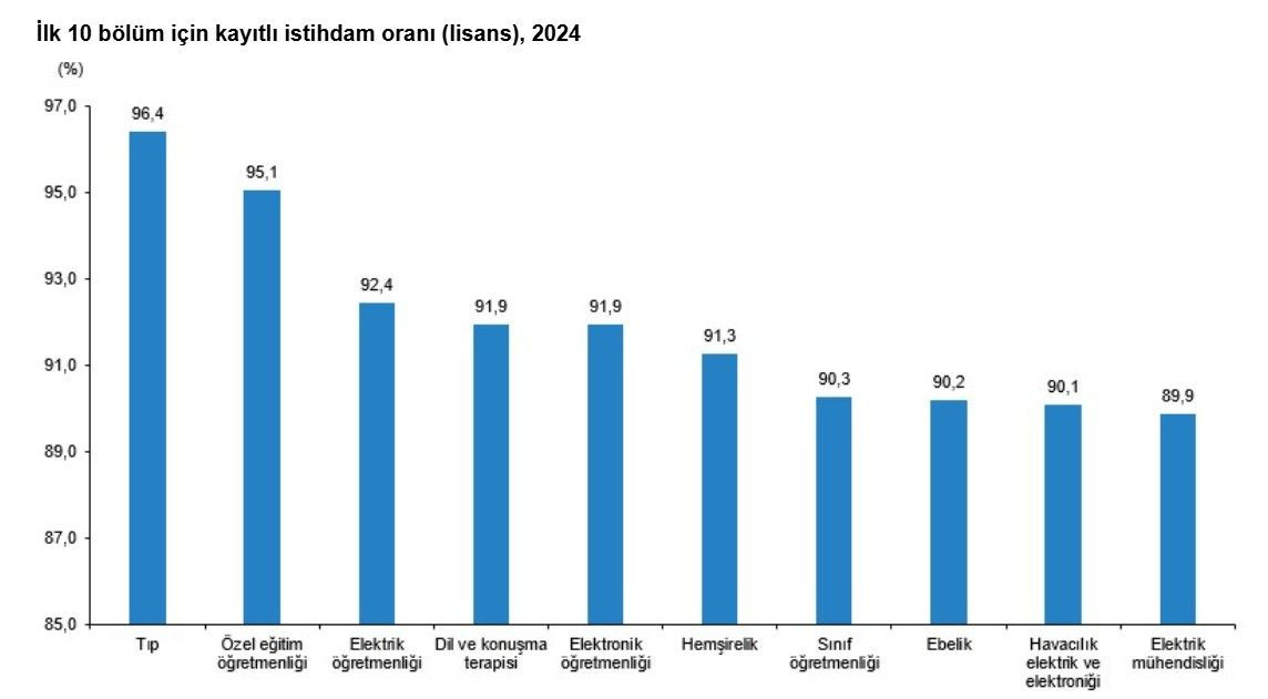TÜİK'in araştırmasına göre lisans mezunlarının kayıtlı istihdam oranı 2023 yılında %75,6 iken, bu oran 2024 yılında %75,0 olarak gerçekleşti. Ön lisans mezunları için kayıtlı istihdam oranı ise 2023 yılında %67,7 iken, bu oran 2024 yılında %66,4 olarak hesaplandı.
