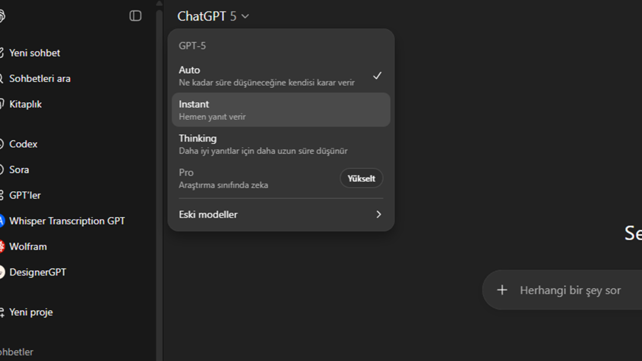 Bu yeni özellikten faydalanabilmek için Plus veya Pro kullanıcı olmanız gerekiyor. Eğer bu kullanıcı gruplarına dâhilseniz, ChatGPT ekranının üst kısmında ChatGPT-5 seçeneğini göreceksiniz. Bu seçeneğe tıkladığınızda, Auto, Instant, Thinking mini ve Thinking modelleri arasından seçim yapabilirsiniz.