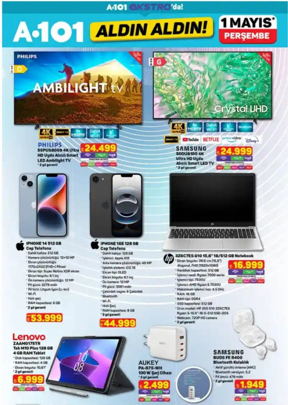 1 Mayıs A101 Ekstra teknoloji ürünleri arasında iPhone 16e akıllı telefon modeli de bulunmaktadır. Bu model, 6.1 inç OLED ekran, A18 çip, Apple Intelligence özellikleri ve 48 megapiksel ikili kamera sistemine sahiptir. 1 Mayıs itibarıyla fiyatı 44999TL'dir.