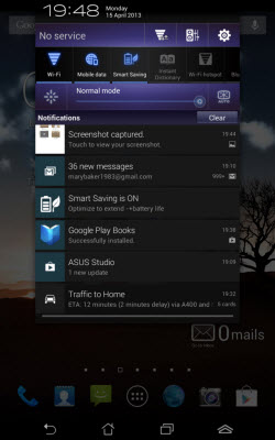 Uyarı alanını mor ve mavi renkleriyle bir miktar özelleştiren Asus, ona hoş, geleceğe yönelik bir görünüm kazandırmayı başarmış. Fonepad, akıcı performansını Jelly Bean'deki "Project Butter"a olduğu kadar Intel Atom Z2420 işlemcisine de borçlu. Bununla birlikte tabletin şimdiye kadar gördüğümüz en hızlı tablet olmadığını da söyleyelim.