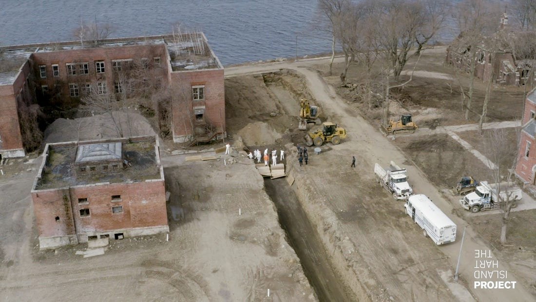 Eski kimsesizler mezarlığının bulunduğu Hart Island üzerinde drone ile çekilen görüntülerde, beyaz koruyucu giysiler giyen işçilerin, cenazeleri büyük bir çukura yan yana yerleştirdikleri görülüyor.