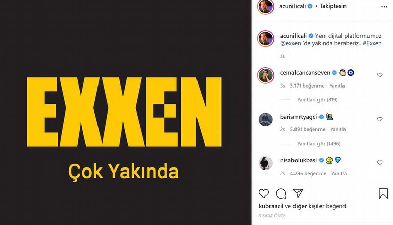 TV8'in sahibi Acun Ilıcalı, dijital TV platform altyapısı kurdu. Ilıcalı, sosyal medya hesabından yaptığı paylaşımla da yeni projesinin adının "Exxen" olacağını söyledi ve "Yeni dijital platformumuz Exxen'de çok yakında beraberiz" ifadelerini kullandı.