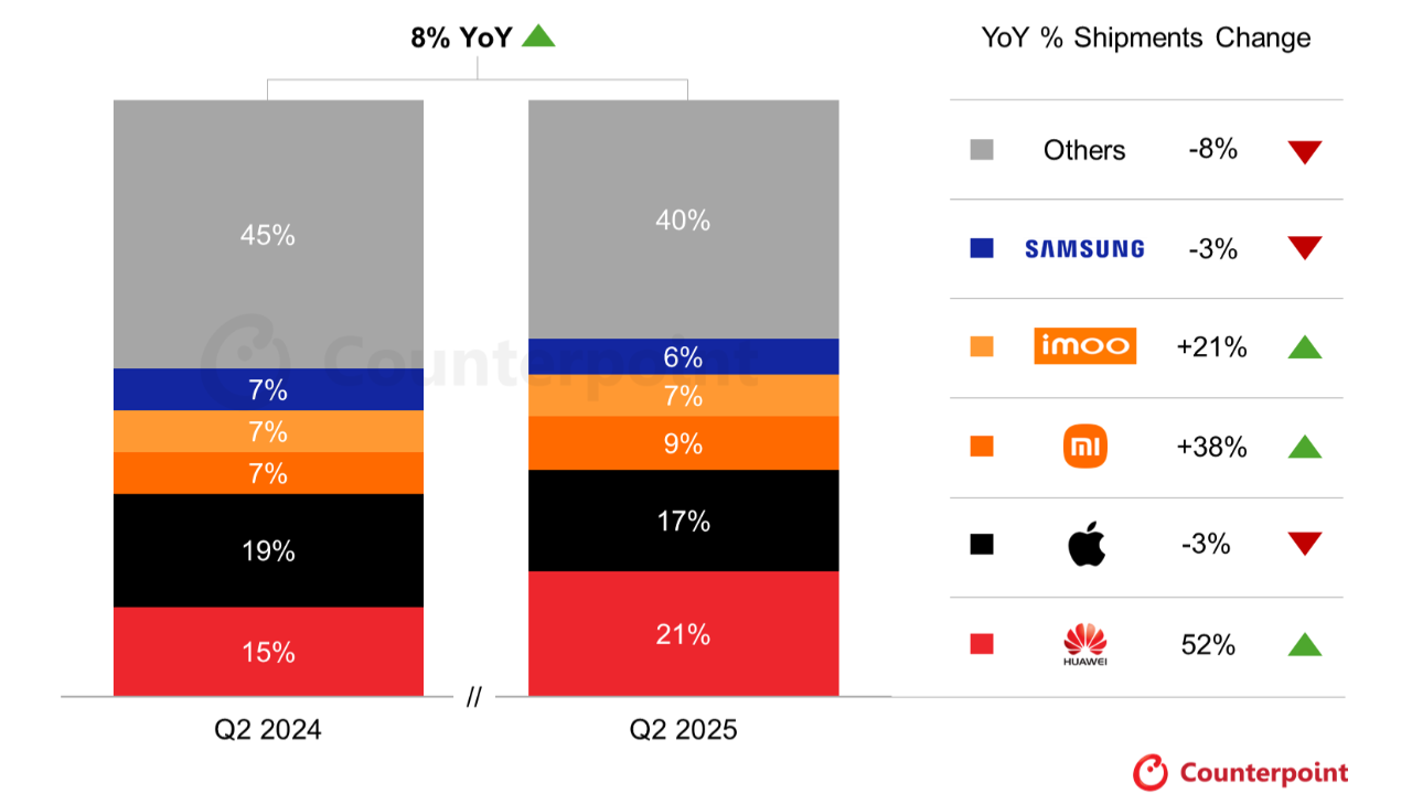Counterpoint’in “Global Smartwatch Shipments Tracker by Model, Q2 2025” raporuna göre, pazarın yeniden canlanmasında Çin merkezli üreticiler önemli bir rol oynadı. Dünyada sevk edilen her 5 akıllı saatten birinin Huawei markalı olduğu belirtildi.