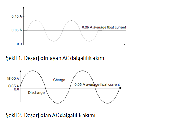 Deşarj davranışı göstermeyen düşük genlikli AC dalgalanmaya sahip şarj akımı (Şekil 1) ile şarj edildiğinde akünün sıcaklığı artar. Akü sıcaklığındaki her 1 oC'lik artış akü ömrünü yaklaşık %10 azaltır. Daha yüksek genlikli AC dalgalılığın üzerine bindiği DC şarj akımı (Şekil 2) ise akünün şarj işlemi sırasında aynı zamanda deşarj da olmasına da neden olur. Bu şekildeki şarj akımı istenmez ve akü ömrünü önemli ölçüde kısaltacak sonuçlara neden olur. Akü ömrünün uzun olması için şarj gerilimi ve buna bağlı olarak şarj akımı saf DC akım formunda olmalıdır.