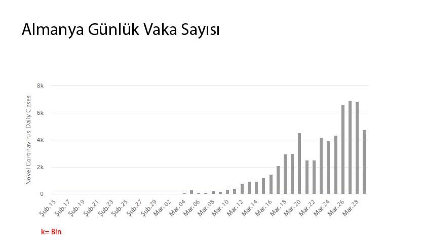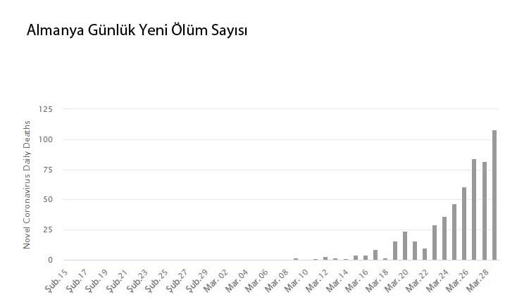 - Almanya Koronavirüs kaynaklı ilk ölümü 9 Mart'ta iki kişi ile gerçekleşti. Almanya'da 26 Mart'ta ölüm sayısı 61 iken, 27 Mart'ta 84, 28 Mart'ta 82 ve 29 Mart'ta 108.