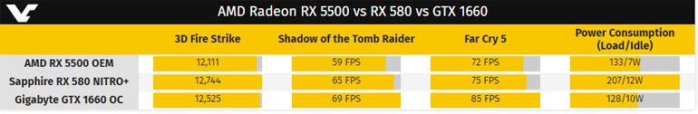 Videocardz tarafından sızdırılan görüntülere göre, yapılan testlerde Radeon RX 5500, GTX 1660 OC ekran kartıyla kıyaslanmış. Arada büyük fark bulunmasa da, Radeon RX 5500, direkt olarak GTX 1660 GPU rakibi değil, şirket bu ekran kartını GTX 1650 karşısına konumluyor. Bu tablolarda her ne kadar GTX 1650'ye ait sonuçlar olmasa da, ortaya çıkan tablo fikir verir nitelikte.