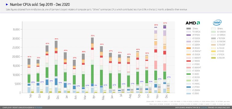 Satılan işlemcilerin büyük bölümünü Ryzen 5000 Zen 3 ve Ryzen 3000 Zen 2 masaüstü işlemcileri oluştururken, elde edilen satış rakamları, aralık ayında satılan toplam işlemci sayısının yüzde 83'ünü oluşturuyor. Intel ise buna karşılık ancak yüzde 17'lik bir pay almış durumda.