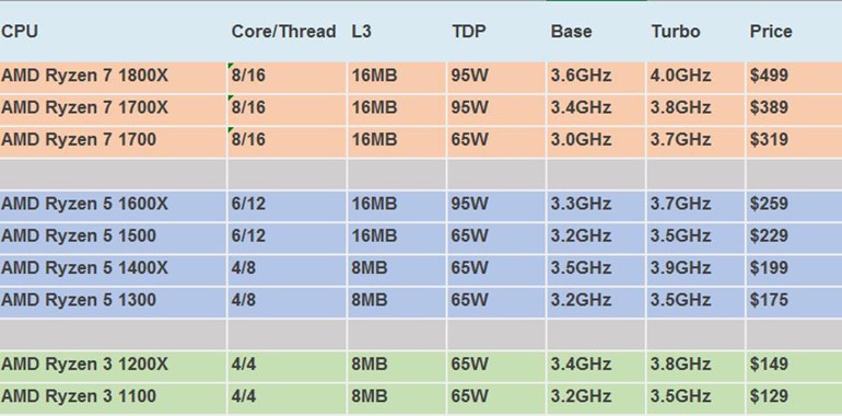 Benchmark notları ortaya çıkan AMD Ryzen, Ryzen 7, Ryzen 5 ve Ryzen 3 şeklinde kullanıcılarla buluşacak. 129 Dolar ila 499 Dolar aralığında fiyatlarla bulunabileceği belirtilen AMD Ryzen işlemciler, kuşkusuz kendi içinde de farklı frekans değerleriyle gelecek. İşte Ryzen platformuna ilişkin uygulanan Benchmark sonuçları ve fiyat tablosu: