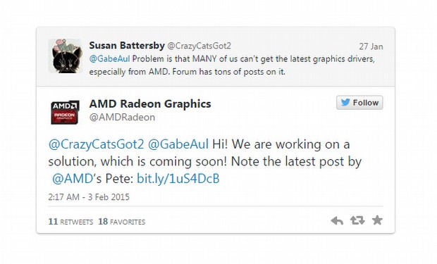 Microsoft forumlarında "Code 43" şeklinde anılan sorun, Twitter'da da kendini gösterdi. Bir kullanıcının Microsoft'tan Gabe Aul'a attığı tweet'e AMD cevap vermekte gecikmedi ve problem üzerinde çalıştıklarını, çok yakında çözüme kavuşturacaklarını iletti.