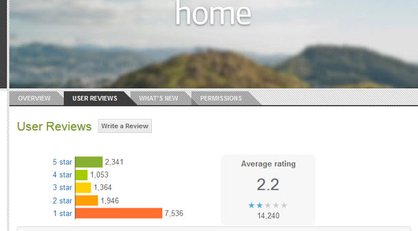 Yaklaşık iki ay önce belirli Android'li cepler için kullanıma sunulan Facebook Home, şimdiye kadar 500 binden fazla kez indirildi ve 14.000'in üzerinde kişi tarafından puanlandırıldı. Ancak 7.500 kişinin çeşitli nedenlerle uygulamayı beğenmeyip, ona sadece tek yıldız verdiği gözlerden kaçmıyor. Bununla birlikte Home'a beş yıldız verenlerin sayısı da 2.300'e ulaşıyor.