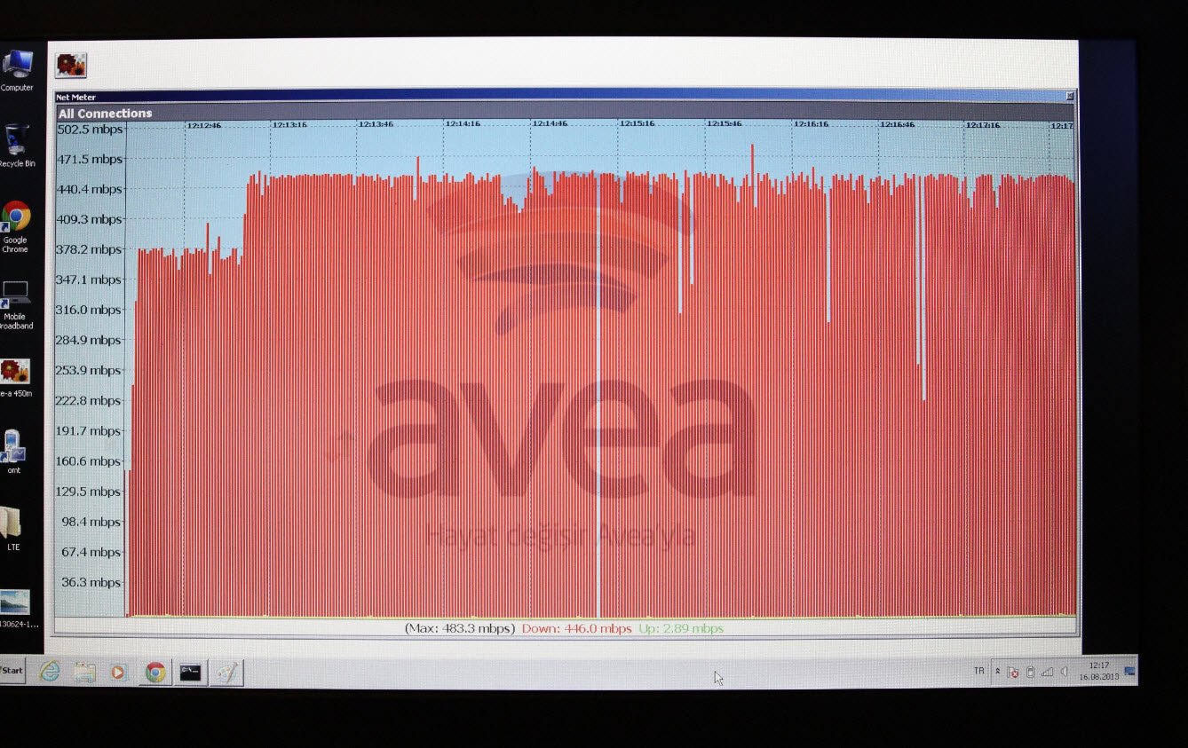 UMTS900 MHz deneme iznini de Türkiye'de ilk olarak geçtiğimiz yıl Mayıs ayında Avea'nın yaptığını belirten Şahin bu testin de Ocak ayında tamamladığını belirtti. 'Teknolojideki trendleri takip eden değil; teknolojiye yön veren ve trendleri belirleyen' bir misyonla bir başka ilki daha gerçekleştirmiş olmaktan dolayı büyük mutluluk duyduklarını söyleyen Dr. Coşkun Şahin 4G testini AveaLabs'te canlı olarak gerçekleştirdi. Test sonucunda Avea daha önceki testlerde de olduğu gibi 3 taşıyıcı ve 3 terminal kullanarak 450Mbps, Kategori-5 adı verilen özel bir terminal kullanılarak da 300Mbps hıza ulaştı.