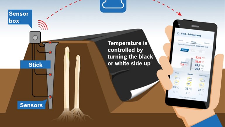 Deepfield® Connect - Asparagus Monitoring sistemi, höyüğe yerleştirilecek yüksek hassasiyetli bir sıcaklık sensörü üzerinden çalışıyor. Toprak sıcaklığının spot ölçümlerini yapan bu sensör, topladığı verileri çiftçinin telefon veya tabletine iletiyor. Böylece çiftçi, sürekli olarak toprağın sıcaklık, nem ve diğer bilgi ve analiz raporlarına anlık erişebiliyor.