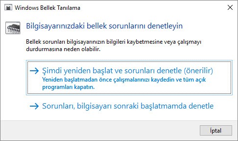 Bu iş için Windows'la gelen bellek tanılama aracını kullanabilirsiniz. Win+R tuşlarına basın ve mdsched yazarak Enter'a basın. Bilgisayarınızı baştan başlatmanız istenecek. Tarama, Windows başlamadan önce gerçekleştirilecek ve herhangi bir sorun bulunursa, Windows başladığında bunu Görev Çubuğunda bir uyarı olarak göreceksiniz.