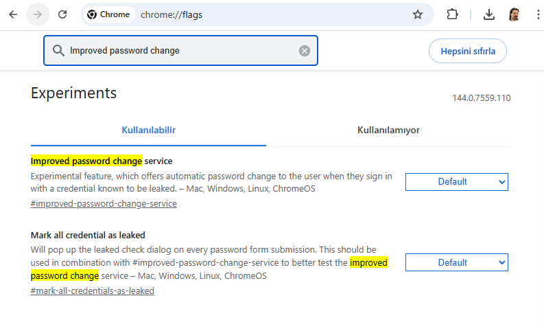 - Ardından, giriş alanına “Improved password change” yazarak doğrudan ilgili ayara ulaşın.