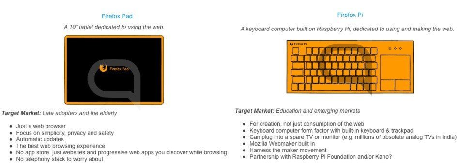 Bunlardan Firefox Pad, 10 inç boyutunda tasarlanan bir tablet biçiminde olacak. Ancak bu tablet, yalnızca web sörfünde kullanılacak. Mozilla her ne kadar bu tablet için "yalnızca web için" dese de, bu boyutta bir tabletten çok sayıda yeteneği bekleyebiliriz. Firefox Pi ise, Raspberry Pi desteği sunan bir klavye aparatı. Bir mini PC olarak bilinen Raspberry Pi'nin yeteneklerini klavye formunda sunacak olan Firefox Pi, üzerinde bir touchpad de bulunduruyor.
