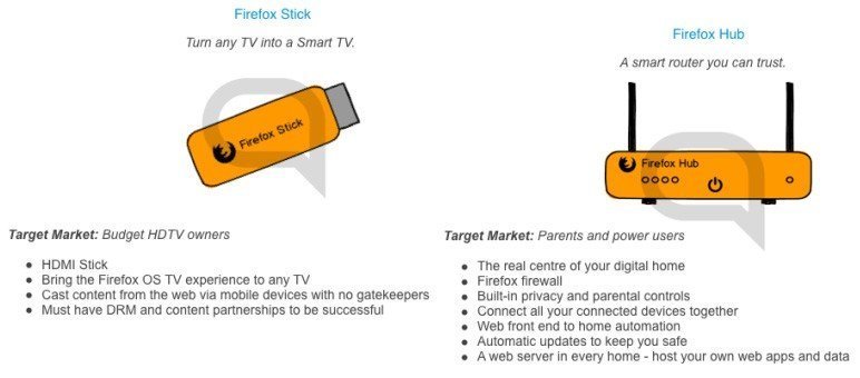 Sızan cihazlardan Firefox Stick, tahmin edilebileceği gibi HDMI üzerinden televizyon veya monitöre bağlanarak ona akıllı özellikler kazandıran bir cihaz olacak. Firefox Hub ise, evdeki cihazları birbirine bağlamak ve ev eğlencesini desteklemek adına atılan bir adım olarak kabul ediliyor. Bu Hub ile her eve bir web server kurmayı amaçlayan Mozilla, Firefox Pad ve Firefox Pi ile de farklı tatlar sunacak.