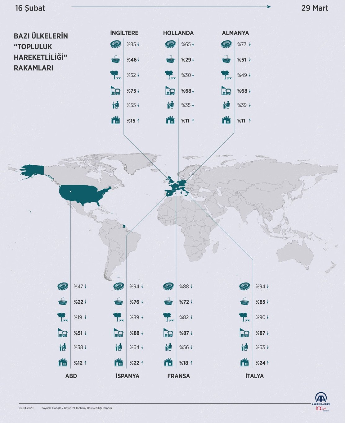 Koronavirüs tedbirleri kapsamında birçok ülke evden çalışma sistemine geçti. İş yerlerindeki hareketlilik oranlarının da yer aldığı rapora göre, İspanya'nın işe gitme oranı yüzde 64 düşerken, Türkiye'nin iş yerlerindeki hareketliliği yüzde 45 azaldı. Hollanda ise yüzde 35'lik hareketlilik oranıyla en fazla işe giden ülke oldu.