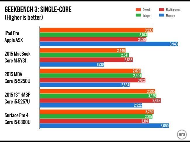 Yine tek çekirdek testinde 3233 skora ulaşan iPad Pro'nun, 2879 puan alan Core i5-5250U işlemciye sahip 2015 model MacBook Air'i kolaylıkla saf dışı bıraktığı görülüyor. Aynı testte 13 inç MacBook Pro 3295 skor alırken, i5-6300U işlemcili Surface Pro 4 ise 3250 puana ulaşmış durumda.