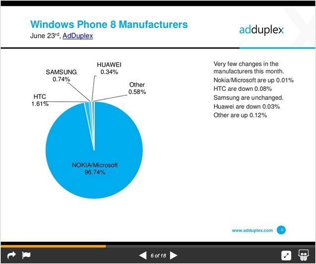 Rapora göre HTC, Samsung ve Huawei gibi devlerin de aralarında yer aldığı üreticiler piyasadaki Windows telefonların sadece yüzde 3.26'sını üretmiş durumda. Lumia serisi telefonlar ise Windows Phone pazar payının yüzde 96.74 gibi devasa bir kısmını elinde bulunduruyor.
