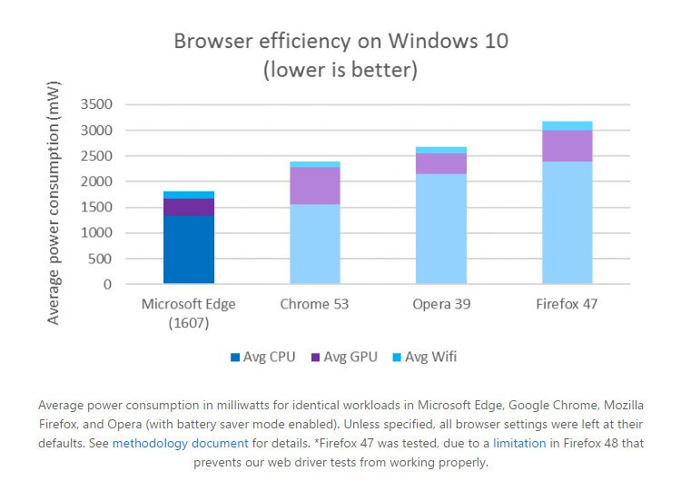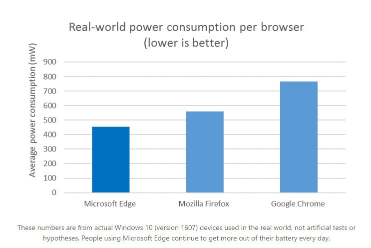 Microsoft'un yaptığı teste göre, Edge Tarayıcı'nın Chrome, Opera ve Firefox'a kıyasla daha verimli çalıştığı grafiklerle görünüyor. CPU, GPU ve Wi-Fi kaynaklarını kullanım oranları üzerinden yapılan testte, her üç kriterde de Microsoft Edge minimum kullanım sergiliyor. Böylece PC'lerde performans verimliliği, dizüstü bilgisayarlarda da performans ve pil verimliliği sağladığını iddia eden Microsoft, yapılan 90 dakikalık Netflix video akışı testinde de bunu kanıtlamış. Diğer tarayıcılara göre yüzde 23 ila yüzde 69 arasında daha verimli pil ömrü sunan Edge, ayrıca CPU ver GPU kullanımını da yüzde 24 ila yüzde 43 arasında daha verimli kullanıyor.