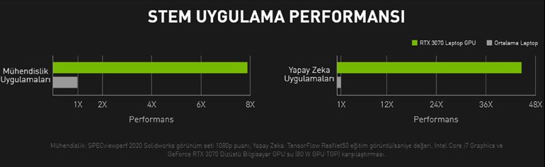 Günümüzde, grafik uygulamalar söz konusu olduğunda STEM ve yaratıcı uygulamalarda yüksek performansa sahip olmak, fark yaratmak için olmazsa olmaz. Dünya'nın en büyük grafik işlemci (GPU) üreticilerinden Nvidia bu bağlamda bu tür kullanıcılara özel olarak odakladığı RTX-30 serisi ile öne çıkıyor. RTX-30 serisi ekran kartları, hem yüksek performans veriyor, hem de kullandığı MAX-Q teknolojileri sayesinde dizüstü bilgisayar üreticilerine daha hafif ve daha taşınabilir ürünler üretme imkânı veriyor. Her gün sırt çantanızda okula, sınıfa, eğitim merkezine taşıyacağınız bir bilgisayarın hafif olması çok önemli. Ancak burada hafiflikten söz ederken, performanstan ödün verilerek, bazı özellikleri "kırpılarak" hafifletilmiş cihazlardan söz etmiyoruz. Bu tür cihazların külfeti, nimetinden daha fazla olduğu için, önerilmiyor.