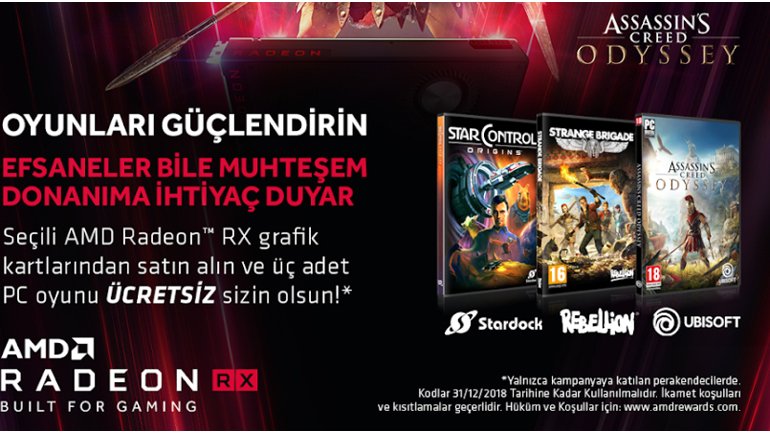 AMD, yaptığı açıklama ile AMD Radeon RX Vega, RX 580 veya RX 570 grafik kartı veya bu kartların bulunduğu sistemleri seçili perakende noktalarından satın alanlara, son dönemin en çok beklenen oyunlarından Assassin's Creed Odyssey, Star Control: Origins ve Strange Brigade'in PC sürümlerini hediye edeceğini duyurdu.