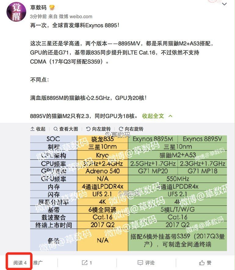 Çin'den gelen son raporlara göre, iki farklı Exynos 8895 yonga seti bulunuyor. Bunlardan biri Exynos 8895M, bir diğer ise Exynos 8895V. İki yonga seti de Güney Koreli elektronik devinin 10nm FinFET teknolojisini temel alıyor. Yine yonga setleri, 4 çekirdekli Exynos M2 CPU (2.5 GHz veya 2.3 GHz) ve 4 çekirdekli Cortex-A53 CPU (1.7 GHz) kombinasyonuyla çalışıyor.