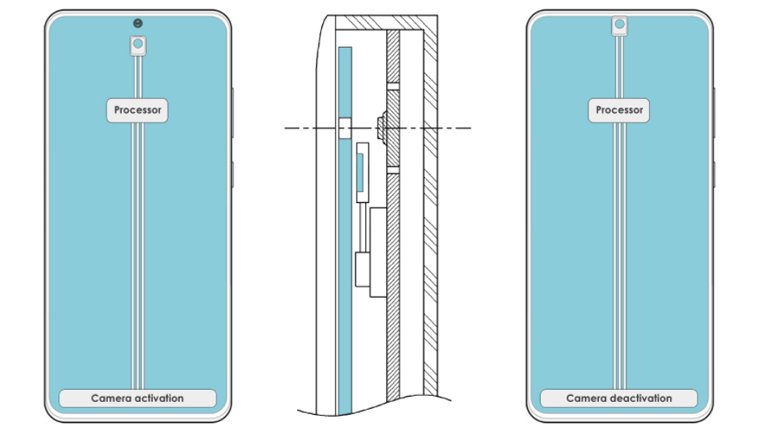 Dünya Fikri Mülkiyet Ofisi'nde ortaya çıkan yeni bir patent örneğine göre Samsung da ön kamerayı gizlemek için bir çözüm üzerinde çalışıyor. Patent örneğine göre şirket yine delikli bir kamera yöntemini deniyor, fakat bu kamera kullanılmadığı durumlarda yerini ekrana bırakıyor. Güney Koreli şirket bunun için ilginç bir çözüme gitmiş ve ekranın altında hareketli bir kamera mekanizması kullanmış.