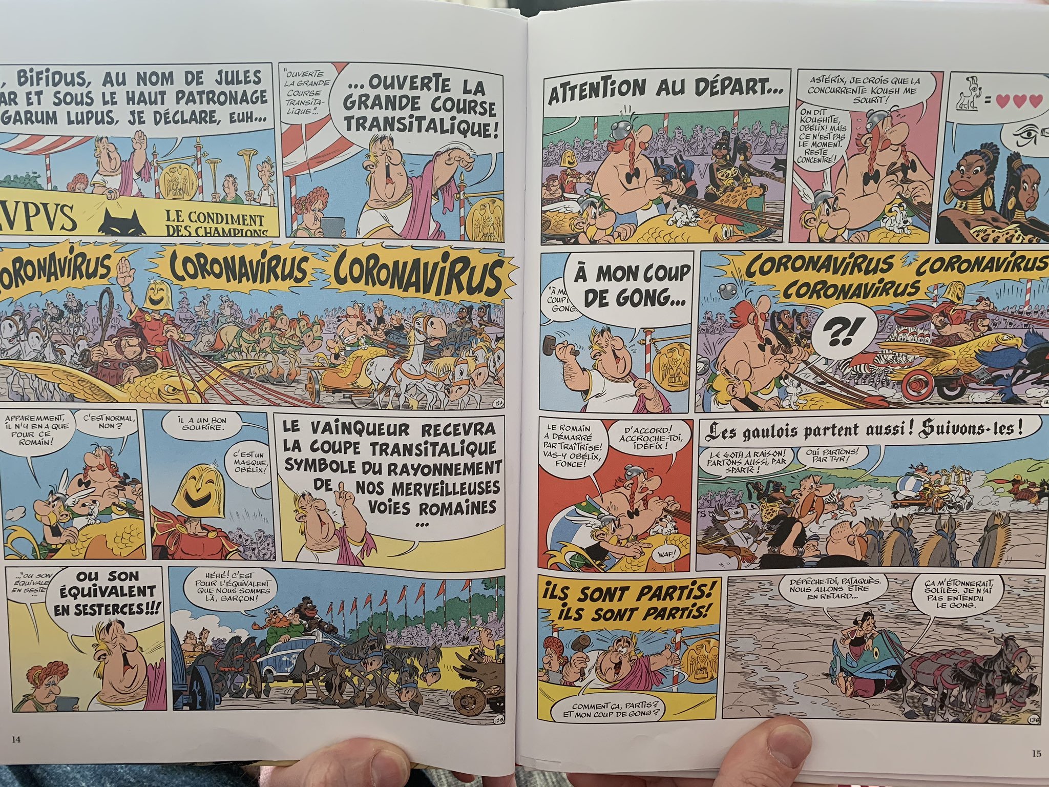Asteriks, çizgi romanda geçen hikayede Corona Virüs'e dikkat çekiyordu. Söz konusu bölümde Galyalı Asteriks karakteri, Romalılarla arabalı at yarışı yapılıyor. At yarışı sırasında, karşı taraftaki Romalıların atlarını yönlendiren kişinin adı Coronavirüs olarak geçirilmiş. Coronavirüs adlı Romalı askerin yüzünde ise maske olması dikkat çekiyor.