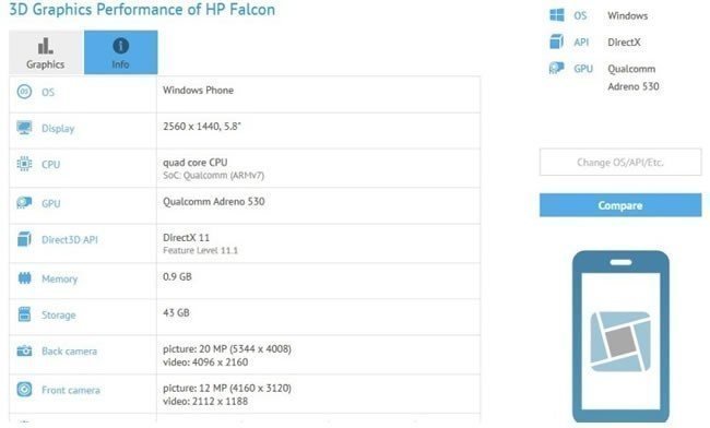 Bahsi geçen HP Falcon isimli cihazın 43 GB kullanılabilir depolama alanı, 2GB RAM, 20MP arka ve 12MP ön kameraya sahip olduğu görülüyor (GFXBench testlerinde kısmi RAM değerleri veriliyor. Kısaca cihazın RAM değeri listelenenin üzerinde olabilir).