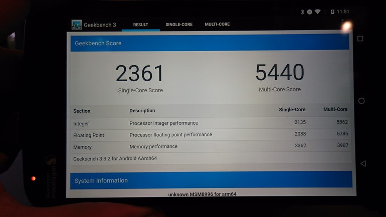 Referans cihaz elimize geçmişken tabii ki tek test ile de yetinmedik. Karşılaştırma için kullandığımız ikinci testte, Snapdragon 820 işlemcili referans cihazı Geekbench 3 ile de test ettik. Tek çekirdekte 2361, çoklu çekirdekte ise 5440 değeri aldığımız testte Snapdragon 801 kullanan Samsung Galaxy S5'in sonuçlarının 938/2836, Snapdragon'un bir önceki işlemcisi olan Snapdragon 810 kullanan Sony Xperia Z3+'ın ise 1244/4117 olması yeni işlemcinin başarısını pekiştiriyor.