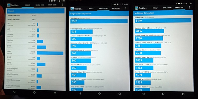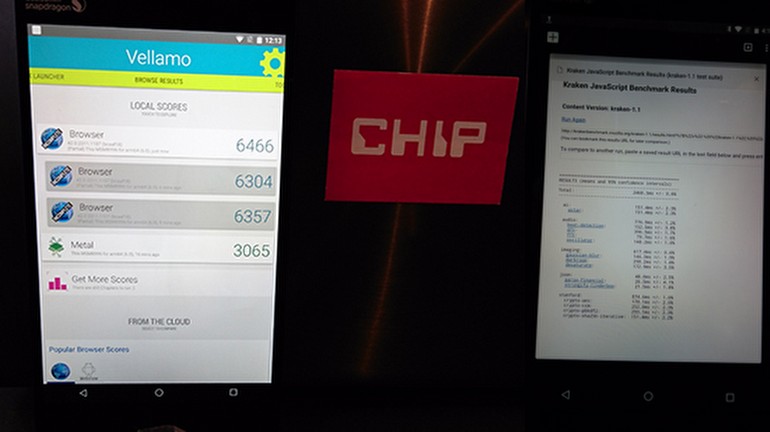 ES 3.1 kullanan Sling Shot'da 2237 değeri elde eden referans cihaz; Samsung Galaxy S6 'nın 1211, Sony Xperia Z5'in 1099 ve HTC One M9'nun 1015'lik skorları ile kıyaslandığında 2016 yılında çıkacak daha da optimize edilmiş amiral gemisi telefonlardan beklentimizi oldukça yükselttiğini de söylemek gerekiyor. Son olarak Vellamo ile test ettiğimiz ve 6466'lık tarayıcı skoru elde eden referans cihazın Kraken'de elde ettiği rakamları ise aşağıda fotoğrafta görebilirsiniz.