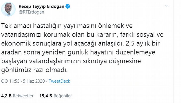 "Fakat vatandaşlarımızdan aldığımız değerlendirmeler, bizi kararı yeniden gözden geçirmeye yöneltti. Tek amacı hastalığın yayılmasını önlemek ve vatandaşımızı korumak olan bu kararın, farklı sosyal ve ekonomik sonuçlara yol açacağı anlaşıldı. 2,5 aylık bir aradan sonra yeniden günlük hayatını düzenlemeye başlayan vatandaşlarımızın sıkıntıya düşmesine gönlümüz razı olmadı. Bunun için, Cumhurbaşkanı olarak, 15 ilimizi kapsayan hafta sonu sokağa çıkma sınırlaması uygulamasını iptal etme kararı aldım. Vatandaşlarımdan, maske-mesafe-temizlik kurallarına bu süreçte de titizlikle riayet etmelerini önemle rica ediyorum."