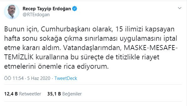 Cumhurbaşkanı Erdoğan twitter'dan yaptığı açıklamada "Cumhurbaşkanı olarak 15 ilimizi kapsayan hafta sonu sokağa çıkma sınırlaması uygulamasını iptal etme kararı aldım. 2,5 ay aradan sonra yeniden günlük hayatını düzenlemeye başlayan vatandaşlarımızın sıkıntıya düşmesine gönlümüz razı olmadı." dedi.
