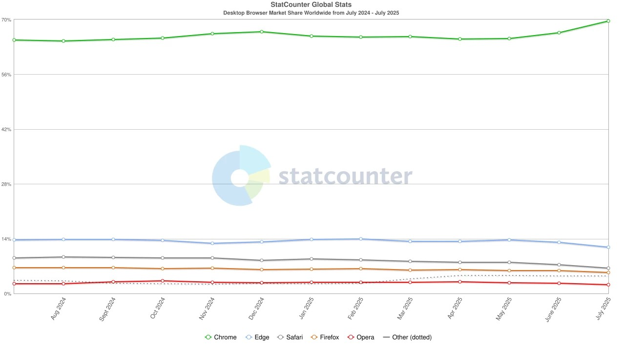 Verilere göre, Google Chrome dünya genelindeki liderliğini daha da pekiştirmiş durumda. Temmuz ayında pazar payını %69,98’e çıkaran Chrome, bir önceki aya göre 3 puanın üzerinde artış yakalayarak neredeyse kendi rekorunu tazeledi. Bu artış, tarayıcı tercihlerinde kullanıcıların istikrarı tercih ettiğini bir kez daha gösteriyor.