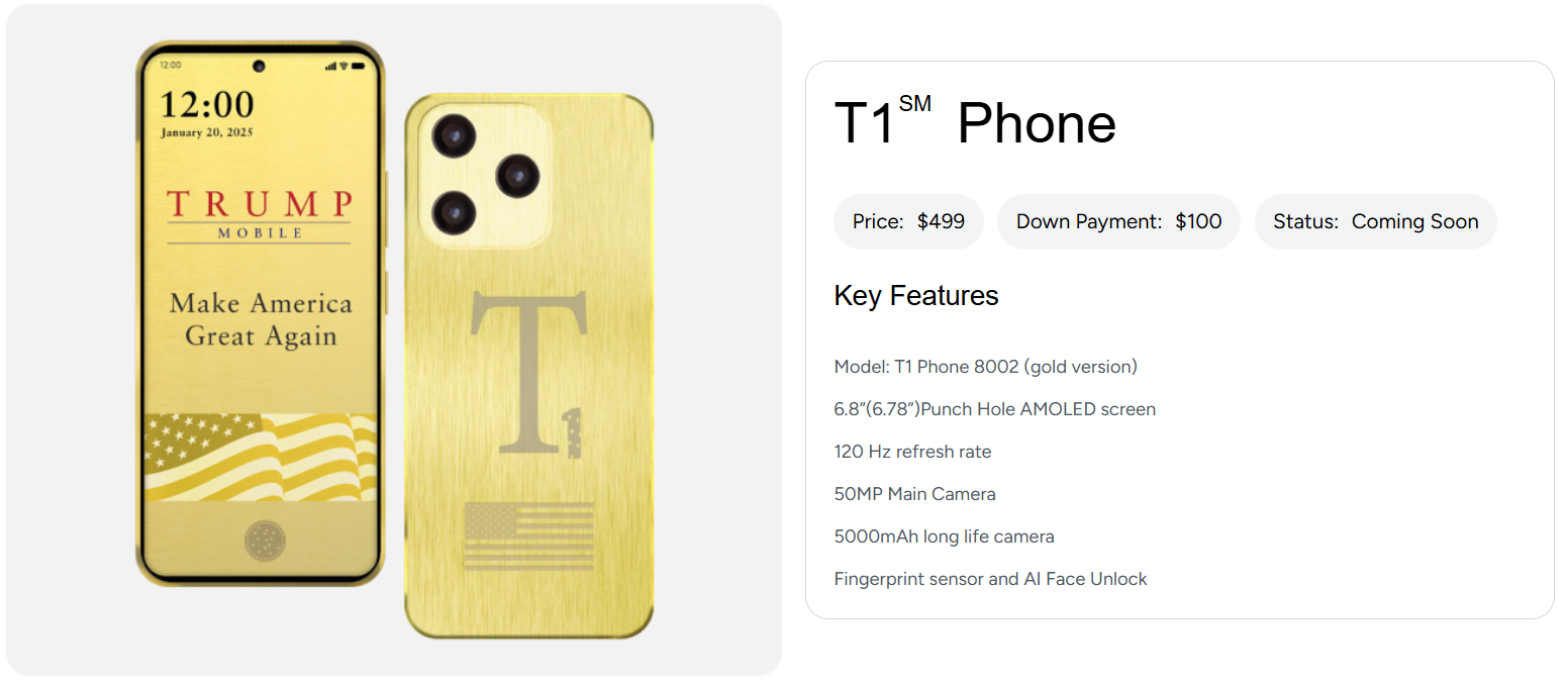 Trump Mobile yalnızca servis hizmetiyle sınırlı kalmıyor. Şirket, Eylül ayında satışa sunulması planlanan kendi telefon modeli olan T1 Phone’u da duyurdu. Amerikan bayrağı motifli altın rengi metal kasası ve üçlü kamerasıyla dikkat çeken telefonun, ABD’de tasarlanıp üretileceği belirtiliyor. Cihaz, şu anda ön siparişe açık.