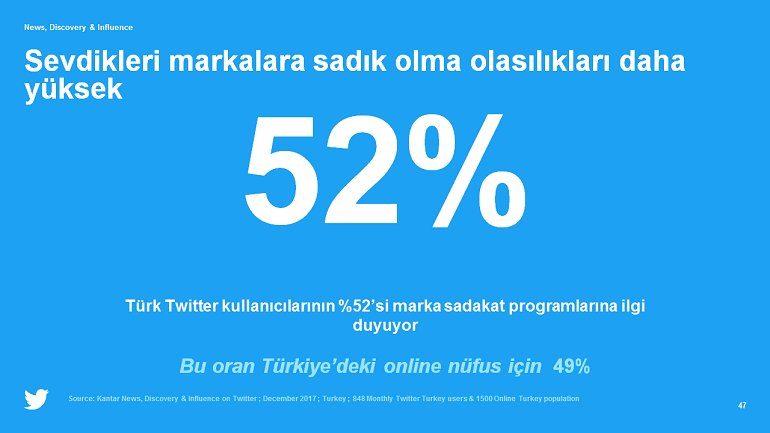 Türk Twitter kullanıcıları farklı açılardan özellikle marka iletişimi için cazip bir hedef kitle olduklarını kanıtlıyor. Yüksek kaliteli ürünler için daha fazla ödeme yapmaya hazır olan Türkiye'deki Twitter kullanıcısı oranı %57. Bu oran Türkiye'deki internet kullanıcıları için %53. Özellikle ürün tercih edilen bir markadan geliyorsa bu istek artıyor (%59 ve %56). Aynı zamanda markalara sadık olma konusunda daha eğilimliler. Bir marka Twitter'daki insanların güvenini kazandığında kullanıcılar sıklıkla sadakat programlarında yer alıyor. Türk Twitter kullanıcıları için bunun oranı %52 iken, Türkiye'deki tüm internet kullanıcıları için %49.