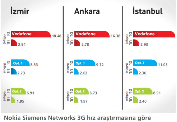 Türkiye'nin 3G'si en hızlı olan şehir 3 operatörün ortalamalarında 21,28 mbps ile Kocaeli, en yavaş şehir ise 4,24mbps ile Adana oldu. 3 büyük şehirde de hem ortalama veri indirme (download) hem de veri yükselem (upload) hızında, Nokia Siemens Networks'un raporunda ilk sırada Vodafone Türkiye yer alıyor.