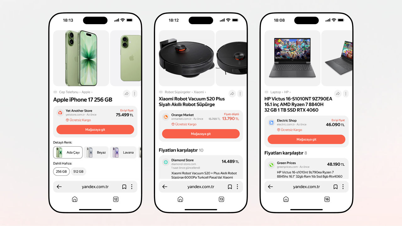 Yandex Alışveriş; Türkiye’deki e-ticaret platformlarının yanı sıra yüzlerce web sitesinden ürün bilgilerini toplayarak kullanıcılara sunuyor. Kullanıcılar, sadece ürün fiyatlarını değil, aynı zamanda farklı satıcıların kargo ücretlerini ve teslimat sürelerini de karşılaştırabiliyor.