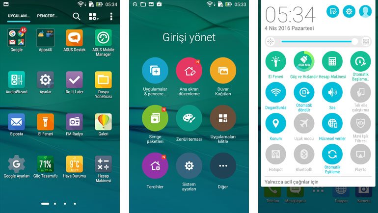 İşletim sisteminin detaylarına gelecek olursak, Zen arabirimini daha önceki ZenFone kullanıcıları yakından tanıyacaklardır kanısındayız. Gayet akıcı ve kullanıcı dostu olarak bulduğumuz arabirim, özellikle üst bardaki geniş araç seçenekleriyle kullanıcı dostu olduğunu gösteriyor. Burada çok sayıda seçenek mevcut durumda, öte yandan burada yer vermek istediğiniz farklı ayarları da getirebiliyorsunuz.