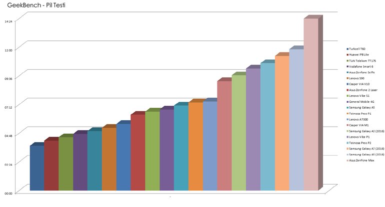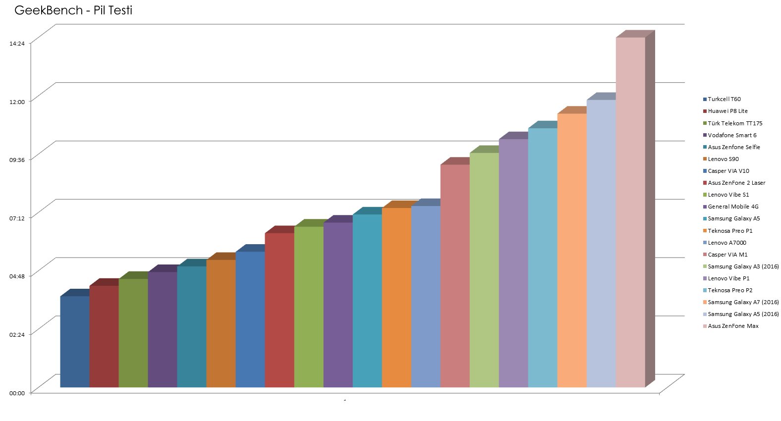 Sentetik test sonucunda Geekbench3'ten 14 saatlik bir pil performansı alan ZenFone Max, bu performansıyla daha önce incelediğimiz Lenovo VIBE P1'i geri bırakmayı başarıyor.