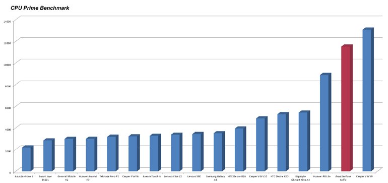 Bir diğer testimiz olan CPU Prime Benchmark'ta yine Huawei P8 Lite'la Casper VIA V9 arasında kalan Zenfone Selfie, yeni nesil orta segment cepler arasında işlemci performansıyla iyi iş çıkartan modeller arasında bulunuyor.