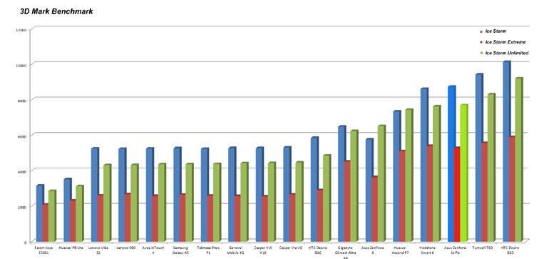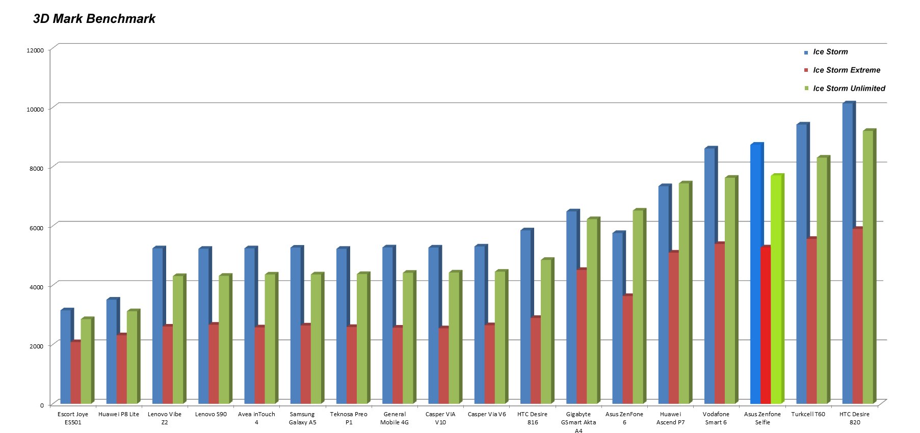 Peki, telefonun grafik işlemcisi 400 MHz'lik Adreno 405 nasıl çalışıyor. 3D Mark sonucuna göre Ice Storm'da 8737, Ice Storm Extreme'de 5276 ve Ice Storm Unlimited'ta 7691 puan toplayan Zenfone Selfie, bu skorla Turkcell T60 ve HTC Desire 820'nin gerisinde kalıyor. Zenfone Selfie'yle aynı işlemci ve grafik işlemciyi kullanan T60'ın buradaki artısı HD ekranı oluyor. Ancak bu grafik işlemci oyunlar için yeterli. Biz incelememiz sırasında telefonla rahatlıkla Mortal Kombat X oynadık.