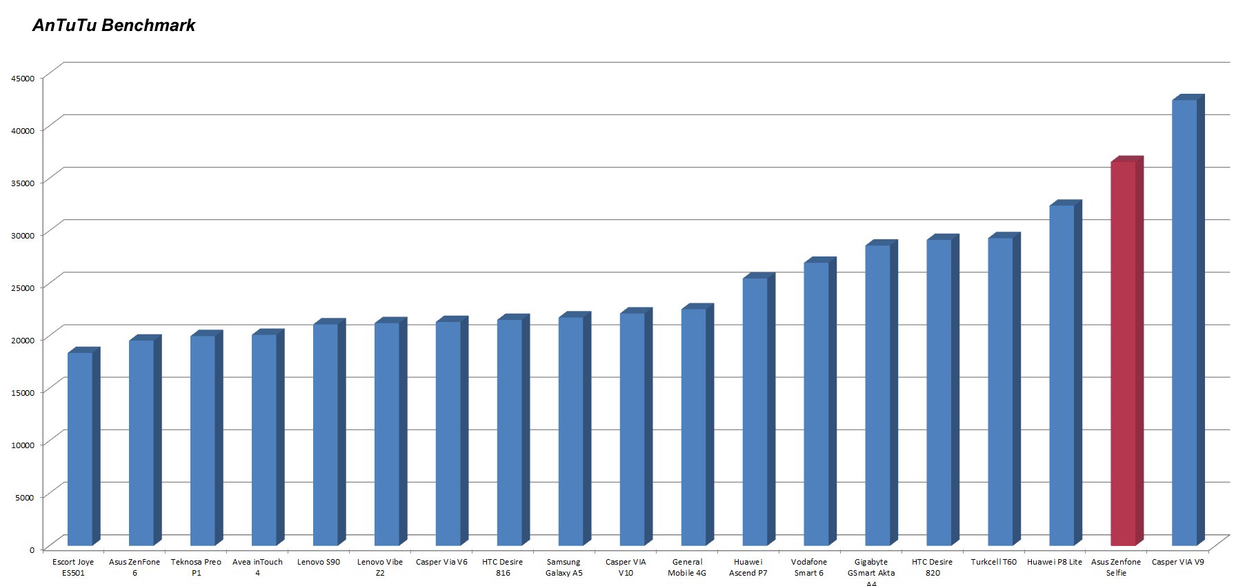 Zenfone Selfie'nin performans çizgisine baktığımızda, ortalama bir performans gösterdiğini görüyoruz. AnTuTu testinde aldığı 36562 puanla Turkcell T60 ve Huawei P8 Lite'ı geride bırakan telefon, MediaTek'li Casper VIA V9'un ise gerisinde kalıyor.