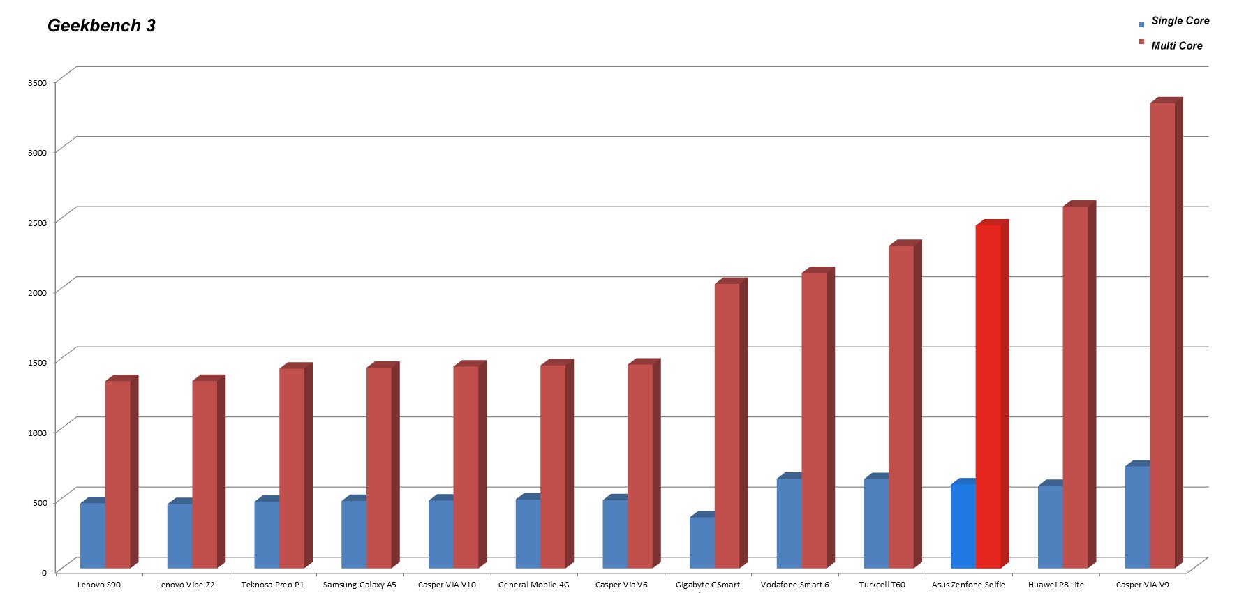 Geekbench 3 skoruna baktığımızda tek çekirdekte 598, çoklu çekirdek kullanımında ise 2446 skor alan Zenfone Selfie, bu skorlarla yine P8 Lite ve VIA V9'un gerisinde, Vodafone Smart 6 ve T60'ın ise bir adım önünde yer alıyor.