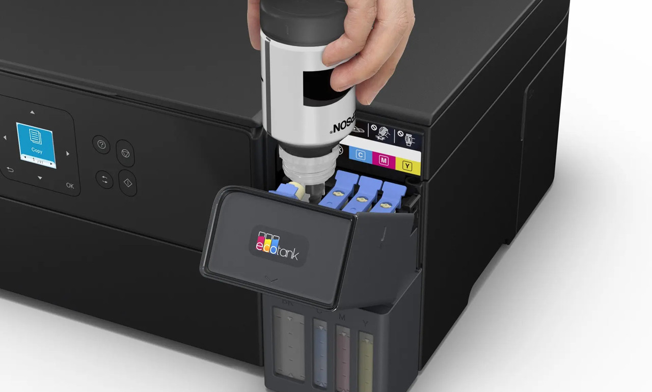 Cihazın ön sağ tarafından mürekkep seviyelerini görebileceğiniz yarı saydam tanklar yer alıyor. Bu sayede her defasında mürekkep seviyesini yazılım veya ekran üzerinden kontrol etmekten kurtuluyoruz. Doğrudan tankları üzerinden seviyeyi fiziksel olarak takip edebiliyoruz.