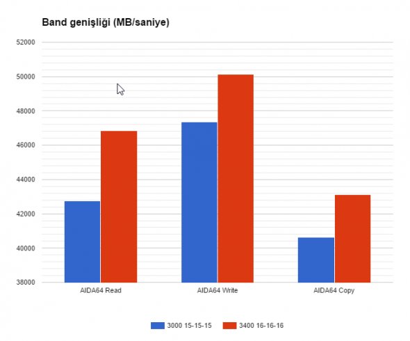 Bellek kitinin performansı son derece iyi seviyede ve üstelik 1.35V gerilimi aşmadan 16-16-16 zamanlamayla 3400 MHz değerine kadar overclock edebildik. By noktada şans da önemli rol oynuyor. Söylentilere göre 4000 MHz değerine 18-18-18 zamanlamayla overclock eden kullanıcılar da var ama garantili değil. AIDA64 testinin sonuçlarına göre frekansla doğru orantılı biçimde okuma, yazma ve kopyalama performansı artış gösteriyor.